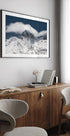 Snow-laden peaks pierce a pale sky as silvery clouds drift across the range. Crisp light chisels every ridge, revealing glaciers, cornices, and deep cobalt shadows. This tranquil alpine panorama by Xiaoyang Wang invites quiet reflection, carrying the hush of high altitude into any space. It leaves a lingering sense of boundless horizon.