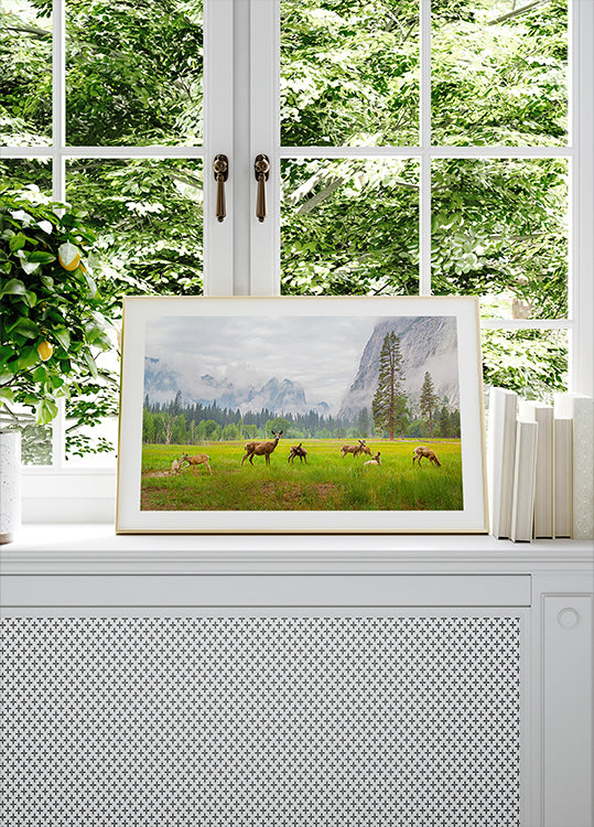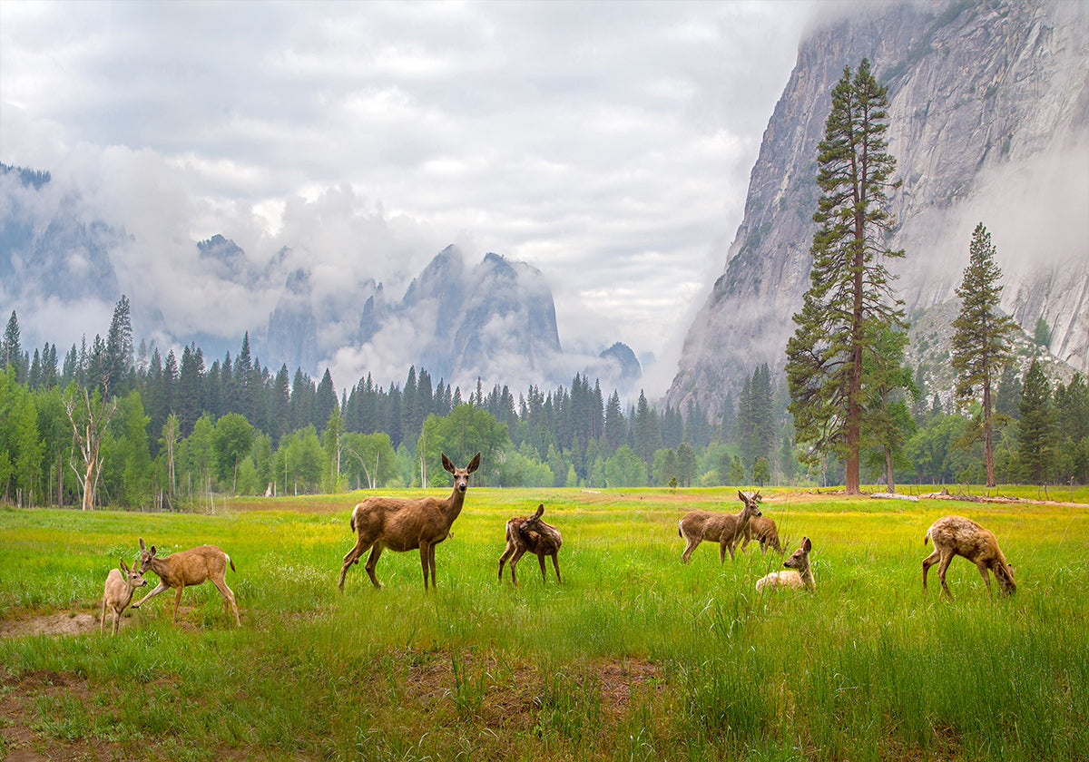 Roe deer drift through a misty Yosemite meadow, antlers catching the first gold of dawn as towering pines and distant cliffs rise like guardians. A hushed procession of the wild, this evocative scene by Dianne Mao invites a timeless pause—where valley, forest, and herd breathe in ancient harmony. Inhale the quiet.
