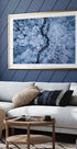 An ethereal winter tableau from above: a frost-laced river winds through snow-draped forest, carving sinuous ribbons of ice and shadow. Crisp whites meet deep blues for a serene, minimalist geometry. Captured by landscape photographer Daniel Gastager, it invites calm, clarity, and awe. A striking focal piece for modern spaces.