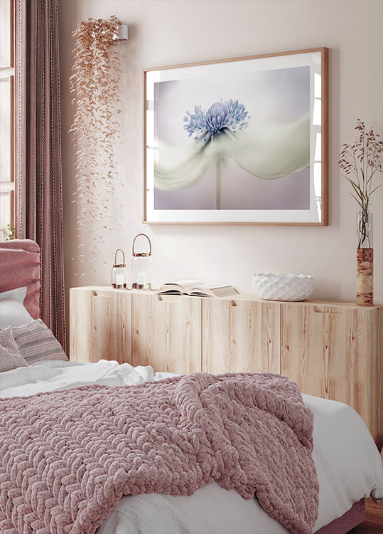 This dreamy macro photograph captures the fragile elegance of a Japanese anemone in soft tones of white and lavender. With its ethereal petals and detailed stamens, the artwork radiates tranquility and purity, making it a refined botanical piece that blends stillness with timeless floral beauty.