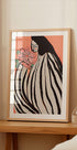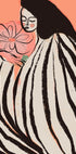 A dreamy and poetic poster featuring a stylized portrait of a woman wrapped in bold black-and-white stripes, gently holding a delicate flower. With its soft peach background and expressive lines, this artwork blends romance, femininity, and modern illustration into a decorative piece full of emotion and charm.