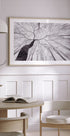 This atmospheric black-and-white artwork captures the view from the forest floor, gazing up at towering tree trunks and delicate branches fading into mist. The composition blends mystery, serenity, and natural geometry, creating a timeless piece that evokes stillness and the quiet beauty of the woods.