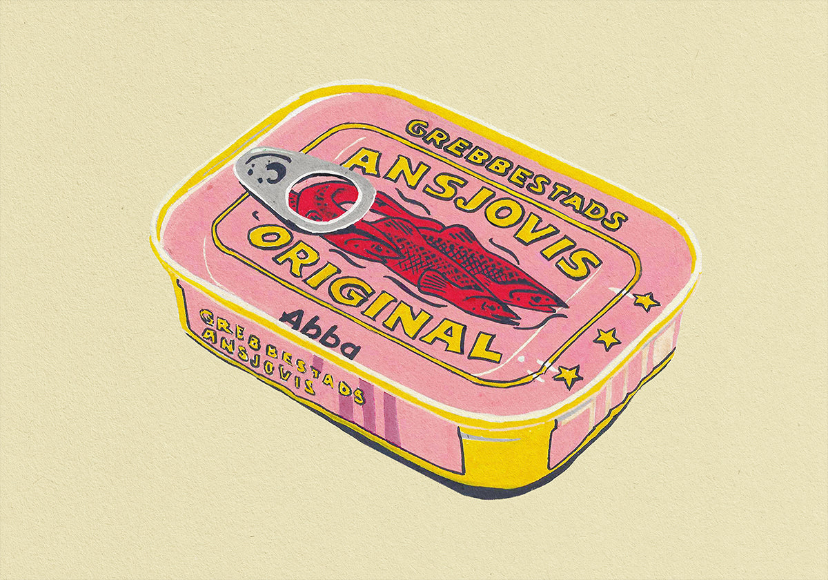 Studio Mandariini reimagines Sweden’s iconic ABBA Ansjovis tin in bold, retro hues: candy pink and deep blue pop against a sunny yellow field, with crisp typography and playful anchovy motifs nodding to Grebbestad’s seafood heritage. A joyful, Scandi-pop statement for kitchens, diners, and gallery walls.