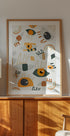 A playful and surreal abstract poster featuring bold eye motifs in warm shades of orange, ochre, and green. With its mid-century modern flair and geometric pattern, this artwork blends whimsy and sophistication, making it a perfect choice for retro-inspired interiors, eclectic gallery walls, or bold boho home decor.