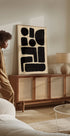 A modern abstract artwork featuring bold black forms scattered across a warm beige background. The textured brushstrokes and organic shapes bring a sense of balance and simplicity — ideal for Scandinavian, Japandi, or contemporary interiors.