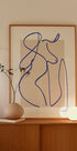 Traced in a single fluid deep blue line against a soft beige ground, Abstract Blue Line Art 2 sketches a graceful feminine silhouette in motion. Minimal yet expressive, the contours feel airy and serene, adding calm balance to bedrooms, studios, or modern living spaces—perfect for Japandi and Scandi interiors.