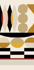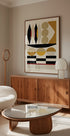 A bold Bauhaus-inspired abstract poster featuring geometric shapes in earthy tones of ochre, beige, and black, accented with red and pink. The clean, structured forms create a striking visual balance, blending modern minimalism with mid-century design—perfect for contemporary interiors or retro-inspired gallery walls.