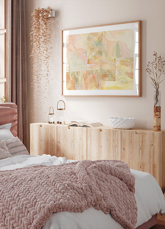 Abstract Composition 4 horizontal by NKTN arranges soft pastel squares and slender rectangles into a calm, mosaic-like rhythm. Gentle blues, blushes, and creams interlock across a wide format, creating balance and quiet movement—perfect for modern spaces seeking a refined, minimalist burst of color.