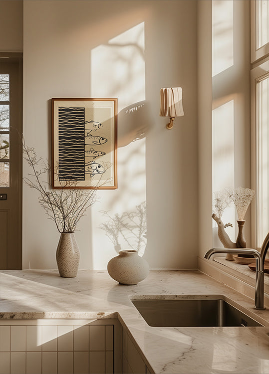 Abstract Fishes On Waves drifts between minimal line work and lyrical motion: sleek fish silhouettes glide atop undulating wave forms, their paths weaving a gentle rhythm across the composition. The flowing curves evoke tides and breeze, bringing a tranquil, contemporary coastal mood to any space. Calming.