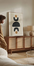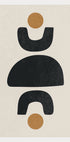 This modern abstract poster features bold black geometric shapes and two burnt orange circles, arranged in a vertically balanced composition. The design evokes harmony, structure, and simplicity, perfect for contemporary and minimalist interiors. The textured background and soft imperfections add warmth and character to the overall design. Ideal for creating a calming, artful vibe in your living room, office, or gallery wall.