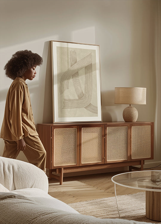 Lucrecia Caporale’s Abstract Sophisticated Line 01 captures a poised, continuous-line figure nestled among balanced geometric shapes. Soft taupe and warm neutrals create a serene, modern mood, blending organic curves with structure for a refined minimalist statement that elevates living rooms or offices.