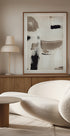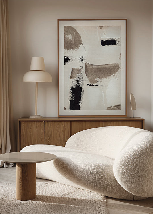 Bold black swipes arc across warm beige and soft white, creating a rhythmic dance of texture and negative space. This minimalist abstract balances energy and calm, echoing Japandi sensibilities. A striking focal point for modern interiors, it adds movement, depth, and quiet sophistication to any room.