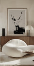 An elegant abstract portrait of a deer emerges from layered shapes and soft, earthy tones. Antlers sweep like branches, blending geometry and brushy texture for a serene, modern feel. A nod to Nordic minimalism, it brings woodland calm and quiet strength to hallways, bedrooms, or a clean, contemporary living space.