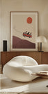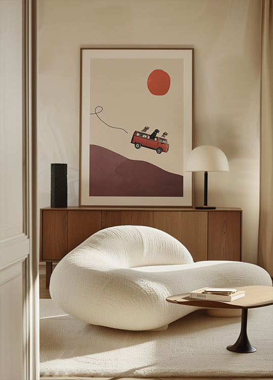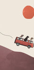 A playful and humorous poster featuring dogs riding in a bright red VW bus across rolling hills under a bold sun. With its whimsical collage style, mid-century feel, and fun storytelling vibe, this artwork captures the spirit of freedom, adventure, and friendship.