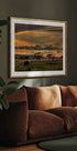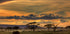 A breathtaking poster of the African savannah at sunset, with golden skies, scattered clouds, and acacia trees standing tall across the misty plains. An elephant grazes in the foreground, capturing the raw beauty of Tanzanian wildlife and nature. Perfect for safari and landscape lovers.