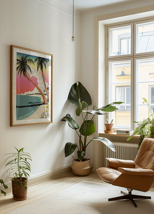 A radiant island ode by artist Nicholas, this retro travel poster captures a Hawaiian sunset blazing over turquoise water. Palm silhouettes sway, hibiscus bloom, and distant volcanic peaks glow at the horizon. Bold Aloha lettering and a gently distressed finish evoke Waikiki surf dreams and timeless wanderlust.