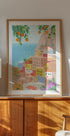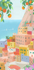 A vibrant illustration of the Amalfi Coast, where pastel-colored houses cascade down the cliffs towards the turquoise sea. Framed by orange trees and flowers, this artwork captures the essence of Italian summer — sunlit architecture, Mediterranean charm, and the joy of travel and holidays.