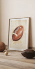 Celebrate the thrill of the gridiron with a striking close-up of an American football, its pebbled leather and crisp white laces rendered with bold contrast against a deep blue backdrop. Clean lines and graphic balance create a modern sports statement—perfect for game-day vibes in any room. A sleek nod to athletic heritage and winning focus.