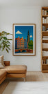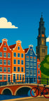 Pedal into Amsterdam’s charm with a vibrant illustration by Taudalpoi: a classic Dutch bicycle rests by a sunlit canal, framed by leafy trees and iconic gabled houses. Reflections ripple in the water, tulip-bright hues pop with retro warmth, and the scene captures springtime wanderlust in the Netherlands.
