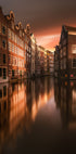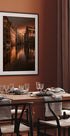 Drift into the hush of Amsterdam at dusk with this artwork by Luca Rebustini: rows of gabled canal houses glow with warm window light as twilight settles, their facades mirrored perfectly in the still water. Subtle reflections, brick textures, and a serene sky capture the city’s timeless charm —a perfect ode to canal-side evenings.