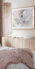 A delicate close-up of a white anemone flower, its soft petals unfurling with graceful movement. Captured in dreamy pastel tones of pink and purple, this botanical artwork highlights the fragility and beauty of nature, offering a serene and elegant touch to any interior space.