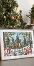 Step into a serene winter woodland where fox, deer, owl, squirrel, and rabbits gather among pines and holly as soft snow drifts down. Mountains fade in the mist, mushrooms peek from frosty earth, and quiet magic fills the air. A charming seasonal scene by artist Caroline Bonne Müller. Tiny birds flit between pine cones and holly boughs.