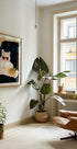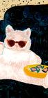 Uma Gokhale’s whimsical pop-art print stars a cool white cat in oversized sunglasses, lounging with effortless swagger. Retro brights and bold shapes add quirky humor as the feline eyes a tempting fish snack. Stylish yet cozy, this playful illustration brings weekend vibes and modern charm to any room.