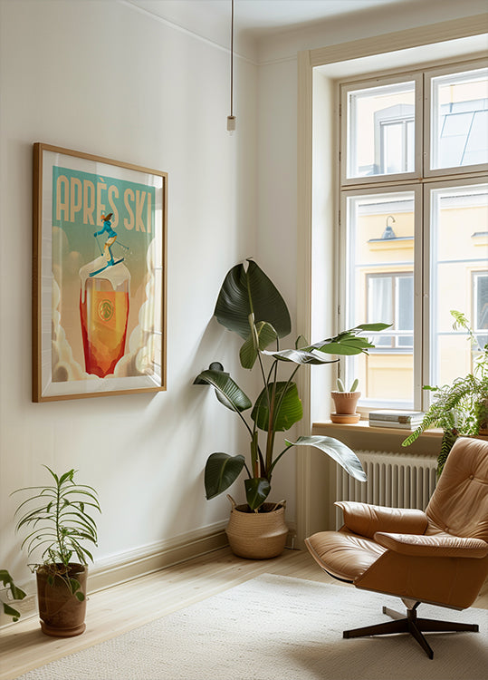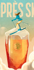 A playful après-ski poster featuring a skier riding down a frothy pint of beer, blending alpine adventure with après-ski celebration. With bold colors and whimsical illustration, this artwork captures the joy of winter sports, festive drinks, and the fun atmosphere of mountain holidays.