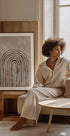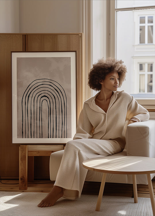 Bold black arches march across a warm beige ground, forming a rhythmic pathway of symmetry and calm. Clean geometry and soft contrast create depth without clutter, nodding to modernist architecture. A quietly striking focal point for serene, contemporary spaces and mindful interiors. Ideal for galleries, studios, and minimalist homes.
