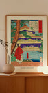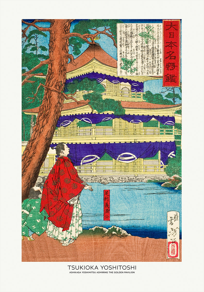 A masterful 1879 ukiyo-e by Tsukioka Yoshitoshi, this scene shows the shogun Ashikaga Yoshimitsu pausing to admire Kyoto’s Golden Pavilion. Delicate lines, flowing robes, and serene architecture evoke refined elegance and courtly poise, bringing a timeless moment of Japanese history to life. Soft light and mirrored water deepen the mood.