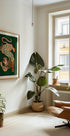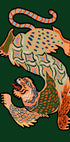A striking abstract illustration of a stylized tiger in vivid colors, set against a bold green background. The artwork combines geometric patterns, flowing lines, and vibrant textures to create a powerful and modern interpretation of the feline spirit. A unique piece of animal-inspired art for lovers of contemporary design.