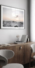 At The Coast 1X by artist Mareike Böhmer captures a quiet shoreline under a soft, cloud-laden sky. Pale sand meets a glassy sea and distant horizon, with cool winter tones and airy minimalism creating a serene, contemplative mood—perfect for spaces seeking coastal calm and modern simplicity. A breath of sea air for minimalist interiors.