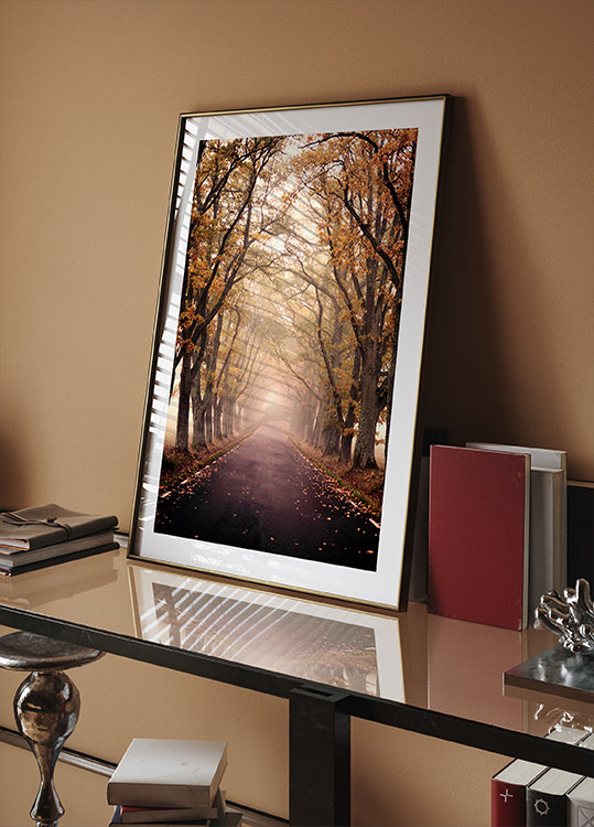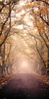 A dreamy autumn avenue lined with tall oaks, their golden leaves glowing through a soft mist. The hazy atmosphere creates a sense of tranquility and mystery, drawing the eye down the endless road. A stunning seasonal wall art piece that captures the beauty of fall landscapes.