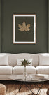 A calm, minimal watercolor poster featuring a single maple leaf floating against a deep, earthy background. The soft washes of warm tan and muted gold highlight the leaf’s delicate veins and natural speckles, while the textured backdrop adds a cozy, gallery-style feel. The composition is simple and centered, giving the artwork a timeless, meditative mood that suits modern, Scandinavian, rustic, or nature-inspired interiors. Perfect for seasonal styling in fall, or as an understated botanical accent year-round.