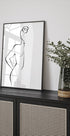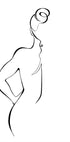 A minimalist line art drawing of a woman seen from behind, captured in flowing black lines against a bright white background. This abstract figurative artwork emphasizes simplicity, elegance, and form, making it a perfect addition to modern and minimal interiors.