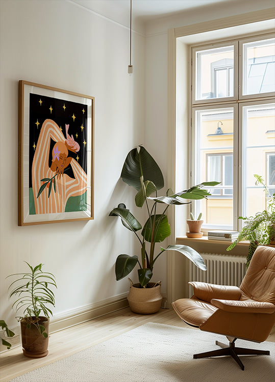Arty Guava’s Balance captures a serene night scene where vibrant shapes find perfect poise. Stylized fish, lush botanicals and juicy fruit stack in playful harmony, set against color-blocked stripes and a star-sprinkled sky. A bold, modern composition that celebrates nature, rhythm and calm. Perfect for kitchens, studios or calm corners.