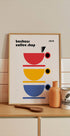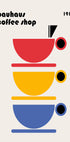 A Bauhaus-inspired coffee shop poster from 1919, featuring three stacked cups in red, yellow, and blue with bold geometric shapes. Minimalist yet vibrant, this design captures the spirit of modernist art and café culture. Perfect wall art for kitchens, coffee shops, and lovers of Bauhaus style.