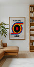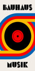 A bold Bauhaus-inspired music poster featuring a stylized vinyl record in black with dynamic red, yellow, and blue geometric lines. This retro-modern artwork celebrates music, rhythm, and design in the spirit of Bauhaus minimalism. Perfect wall art for music lovers, record collectors, and modern interiors.