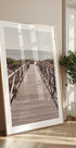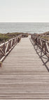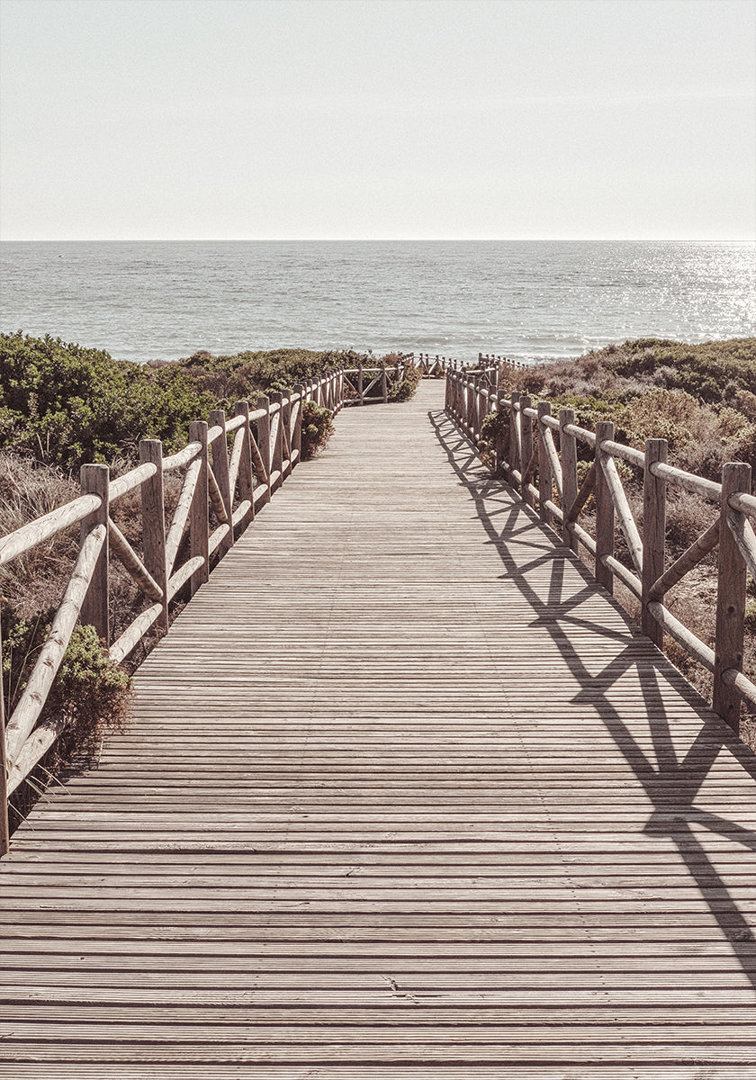A serene coastal photograph capturing a wooden boardwalk leading directly to the shimmering sea. The vanishing point perspective invites the viewer to walk toward the horizon, evoking peace, freedom, and the calm of summer days.