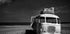 A haunting black-and-white photograph of an abandoned vintage bus stranded on a sandy beach. With worn suitcases stacked on its roof and the open sea in the background, the image conveys desolation, forgotten journeys, and the passage of time.