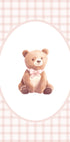 Sweet and nostalgic, this watercolor by Melloi Art Prints portrays a cuddly teddy bear in a seated pose, painted in soft browns and creams with a delicate pink bow. A subtle checkered backdrop and pastel tones add playful charm, creating a calm, cozy focal point for nurseries, kids’ rooms, or thoughtful baby gifts.