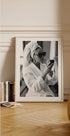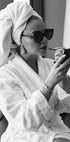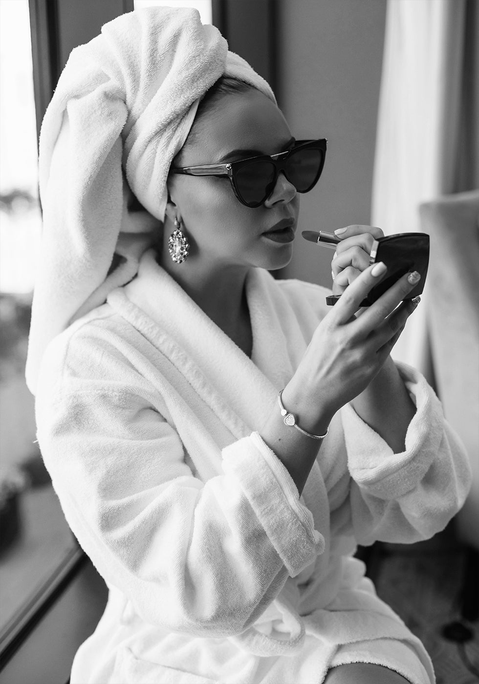A sophisticated black and white photograph of a woman in a robe with a towel wrapped around her head, applying lipstick while wearing sunglasses and statement jewelry. This elegant artwork celebrates the beauty of small rituals and timeless glamour, making it perfect for fashion-forward interiors.