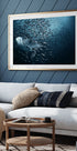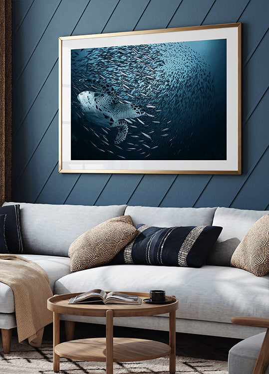 A stunning underwater poster featuring a sea turtle gliding through a swirling shoal of fish in the deep blue ocean. Captured in Thailand’s Similan Islands, this wildlife scene embodies the beauty and chaos of marine life.