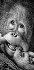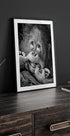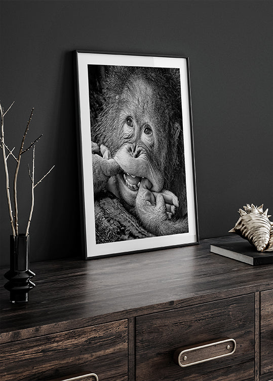 A humorous and heartwarming black-and-white portrait of a young primate with a playful expression. Capturing joy, innocence, and a cheeky smile, this artwork brings warmth and humor to any wall.