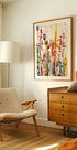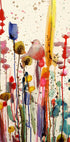 A vibrant watercolor artwork featuring a whimsical bird perched among abstract floral shapes. Splashes of color drip and blend across the canvas, creating a dreamy, painterly effect. This piece captures the lighthearted beauty of nature through playful brushstrokes and vivid tones.