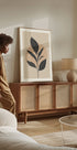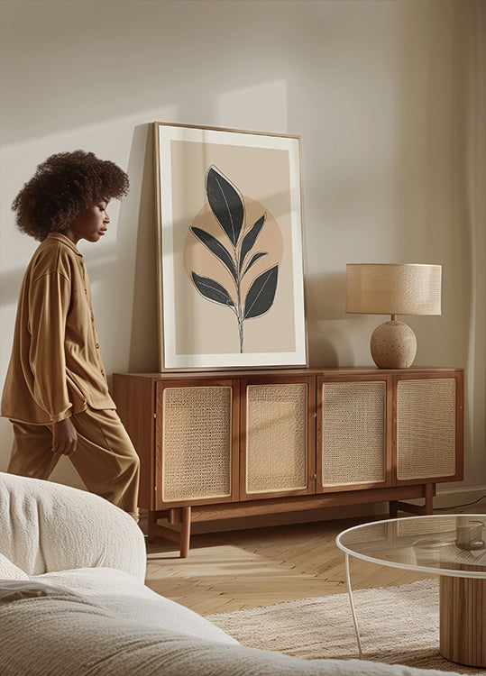 A bold black botanical silhouette rises from delicate stems, its sculptural leaves set against warm beige tones and soft geometric shapes. Clean lines and generous negative space create a calm, modern balance—ideal for minimalist interiors, Scandinavian styling, or a serene gallery wall. Subtle texture and rhythmic forms lend an artful classic look.