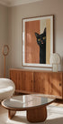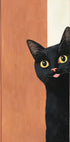 A curious black cat peeks from behind a doorway, golden eyes wide and whiskers forward, ears pricked in alert mischief. Half-hidden in shadow, its tiny pink tongue and glossy fur add a playful spark. A witty, minimalist portrait that brings charm, humor, and a touch of mystery to any room. Perfect for pet lovers.