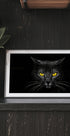 A powerful close-up portrait of a black cat with piercing yellow eyes glowing in the darkness. This low-key photograph captures mystery, elegance, and intensity, making it a striking piece for any modern interior.