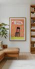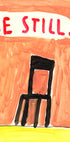 A bold black chair anchors the scene, sketched in naive, modern‑expressionist strokes against layered fields of orange and red. Whispered, hand‑lettered words drift around it, suggesting calm and focus. This minimalist composition by Agata Królak brings warmth and meditative balance to any room, inviting a moment of calm.
