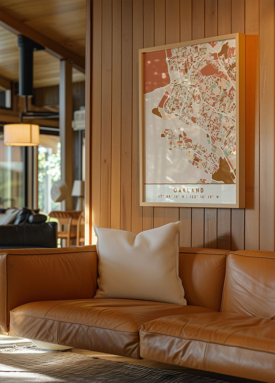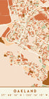 Emiliano Deificus maps Oakland in moody earth tones, layering shoreline, hills, and a precise street grid over a deep black field. Subtle geometry, latitude ticks, and tonal blocks sculpt a calm, modern mosaic—an elegant tribute to Bay Area rhythm, urban structure, and minimalist design. Harbor edges and freeway arcs glow in warm neutrals.